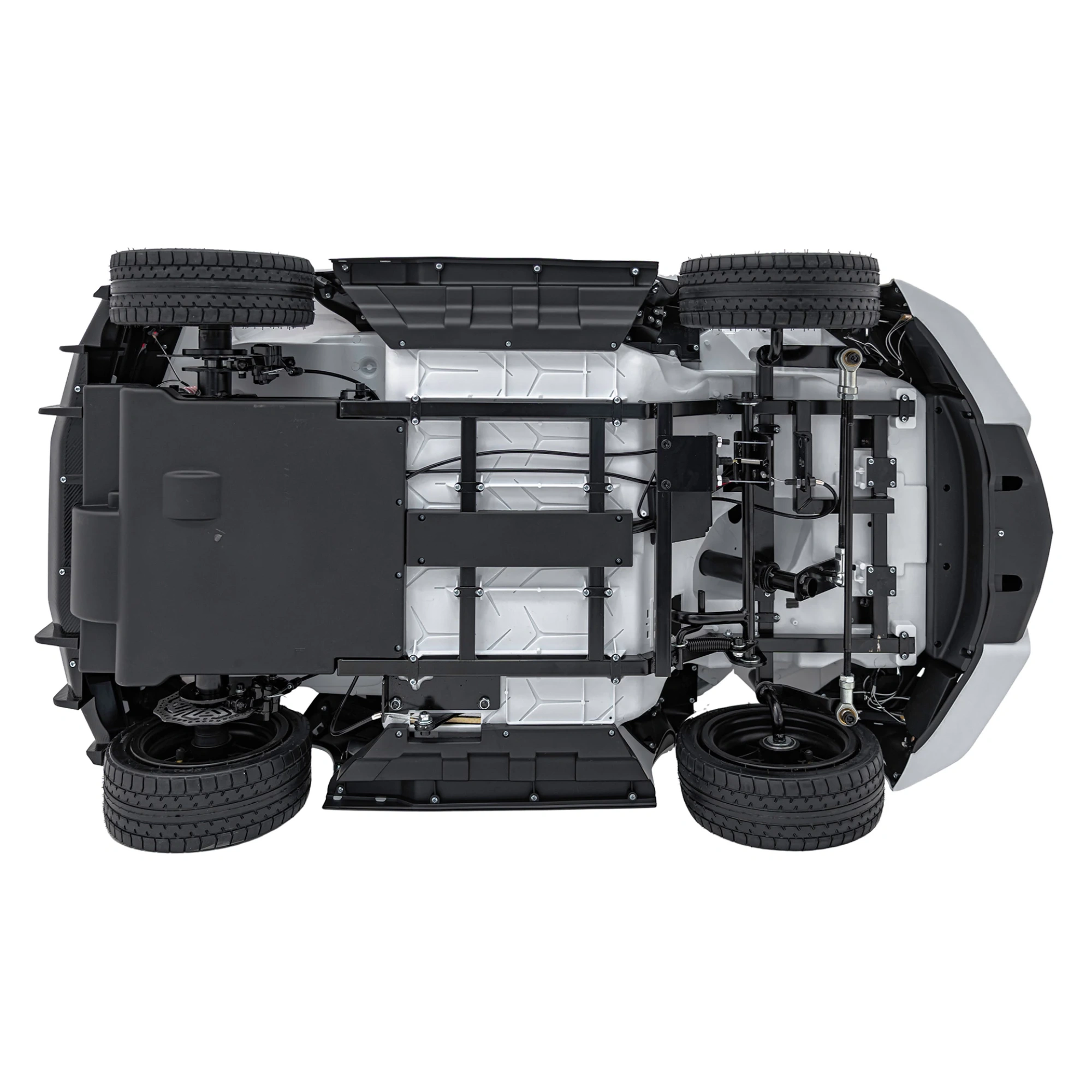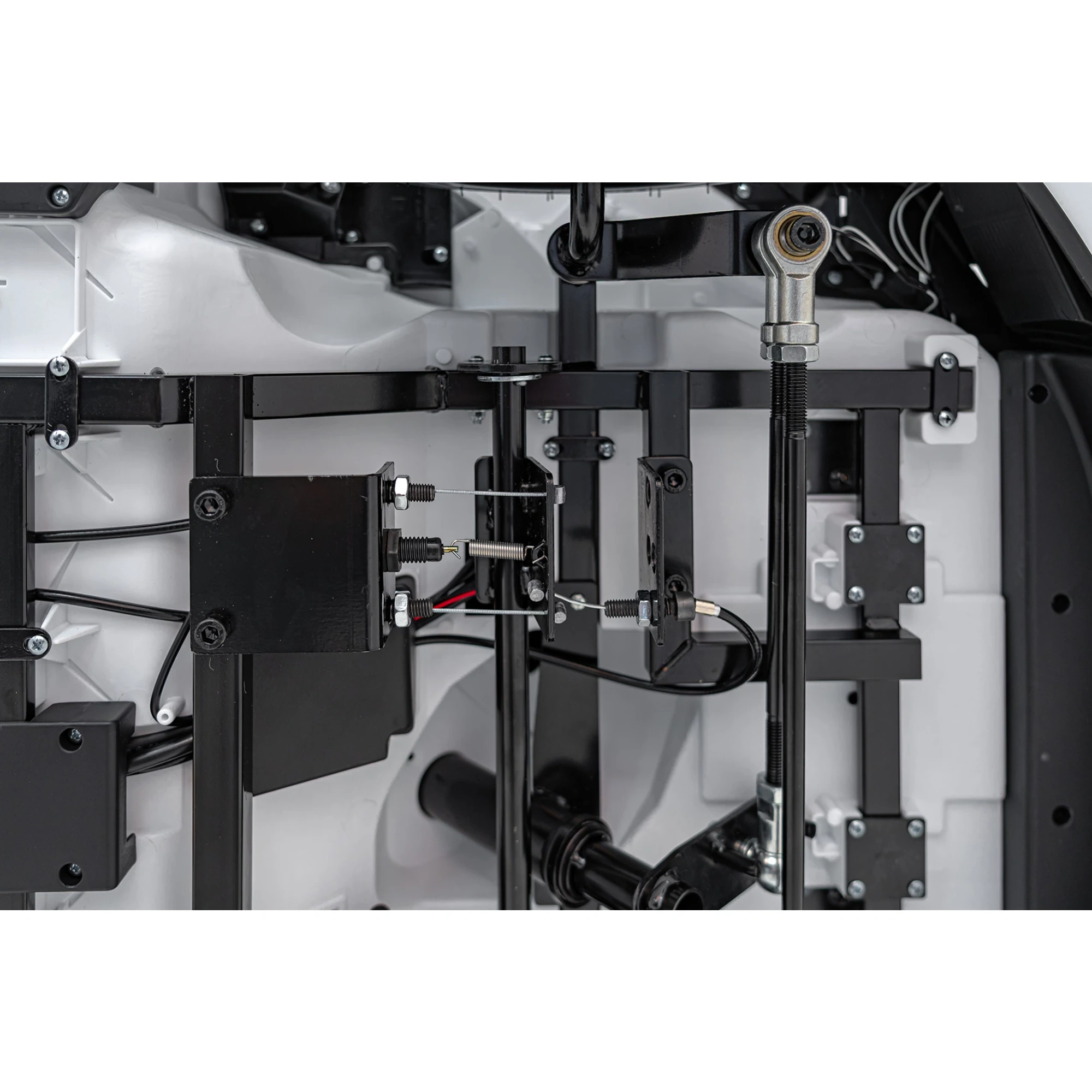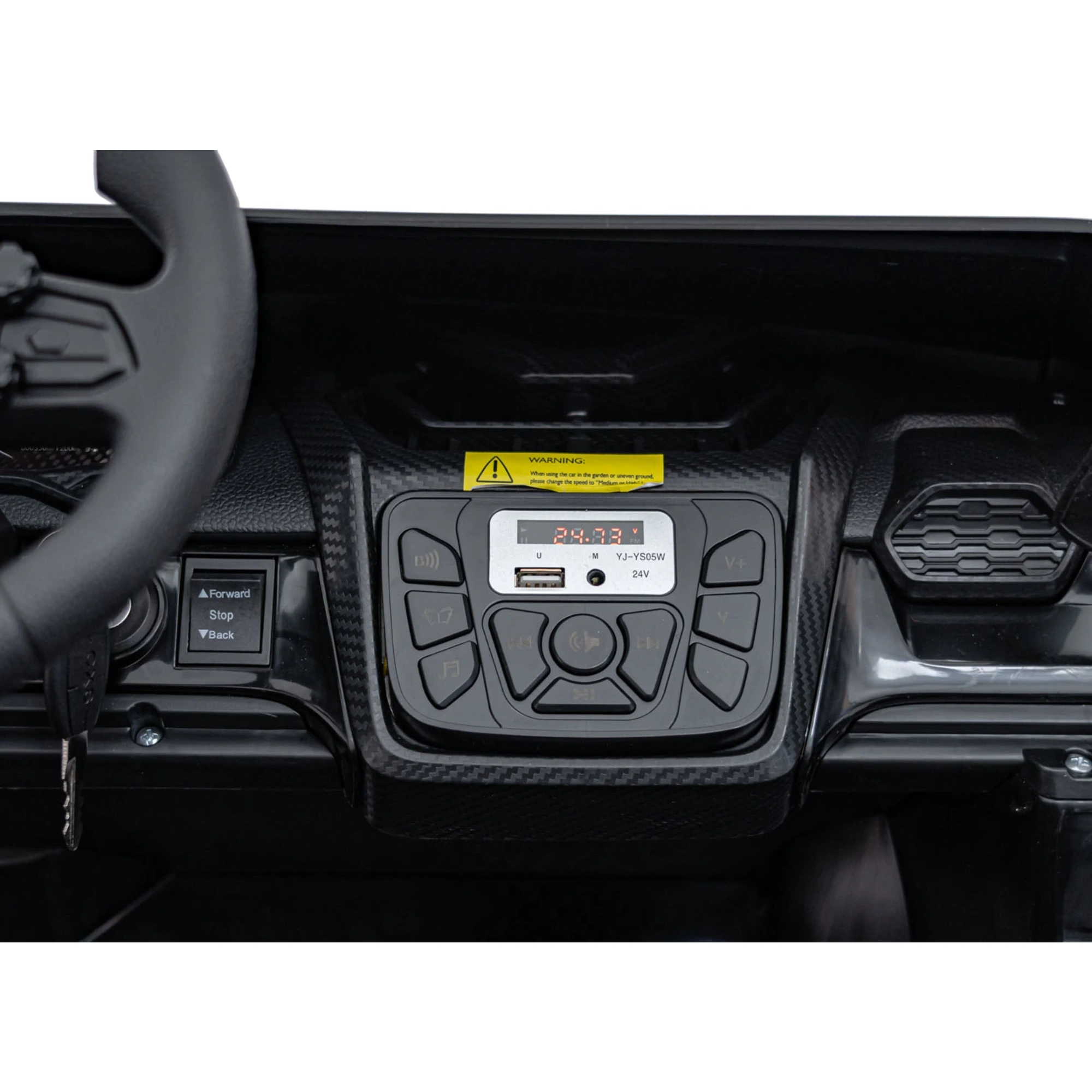 Autko posiada oczywiście prędkość płynnie regulowaną pedałem potencjometrycznym z 3 biegami prędkości maksymalnej i pedał hamulca, a oddzielne fotele wraz z pasami pozwalają na dość komfortowe przejażdżki młodym rajdowcom.