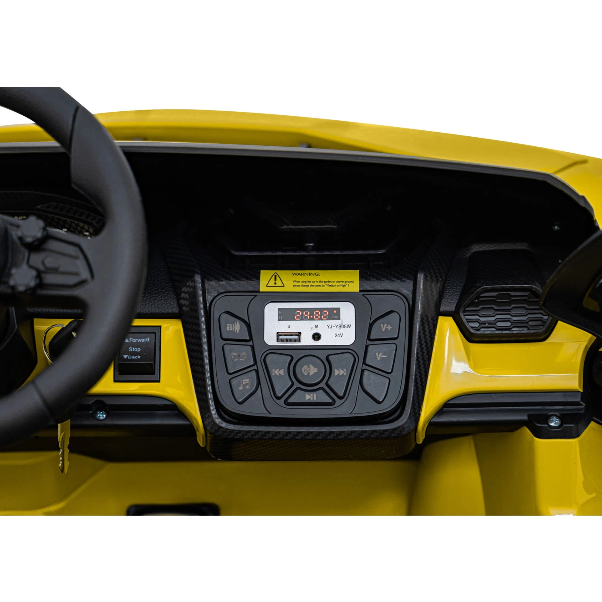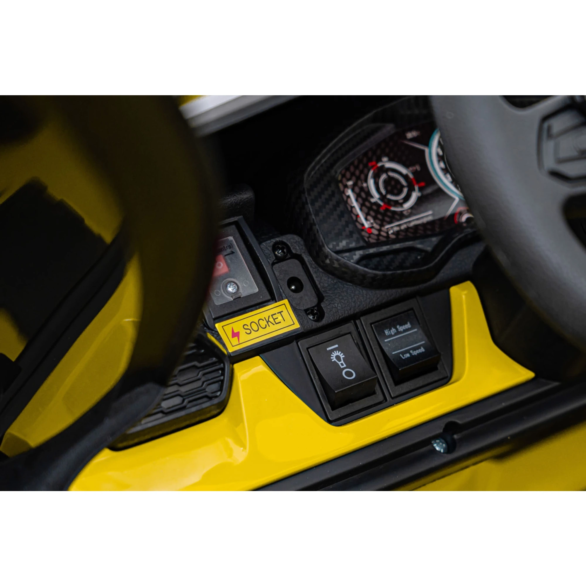 Autko posiada oczywiście prędkość płynnie regulowaną pedałem potencjometrycznym z 3 biegami prędkości maksymalnej i pedał hamulca, a oddzielne fotele wraz z pasami pozwalają na dość komfortowe przejażdżki młodym rajdowcom.