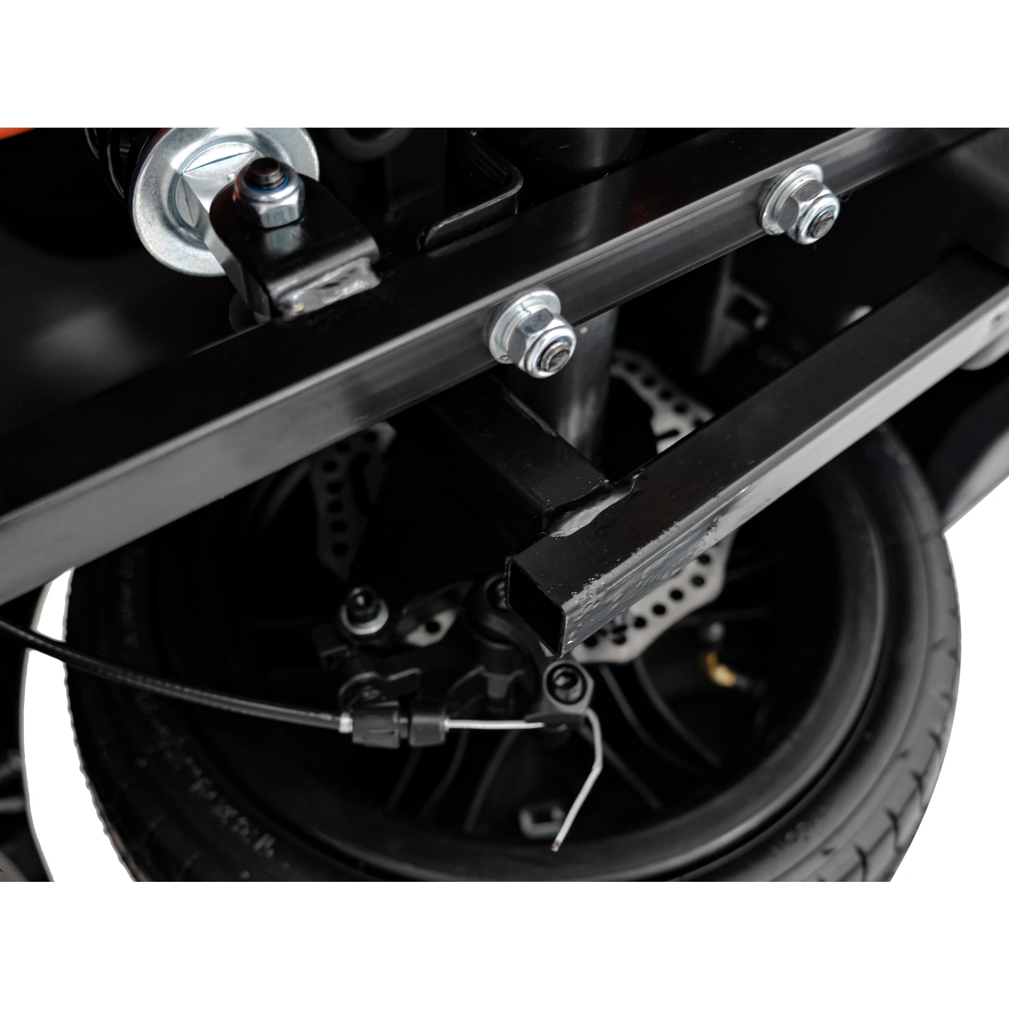 Prędkość płynnie regulowana pedałem potencjometrycznym, dodatkowy hamulec ręczny, 2 biegi prędkości maksymalnej, oddzielne ruchome fotele wraz z pasami bezpieczeństwa i w pełni amortyzowanym podwoziem pozwalają młodym kierowcom na w pełni komfortowe poruszanie się po terenach utwardzonych.