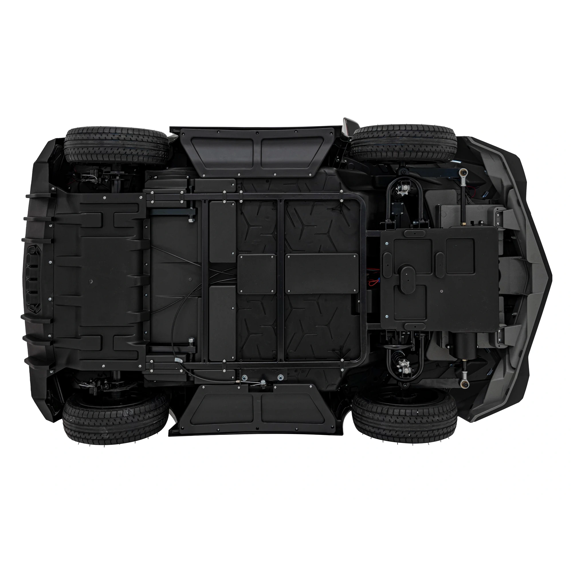Prędkość płynnie regulowana pedałem potencjometrycznym, dodatkowy hamulec ręczny, 2 biegi prędkości maksymalnej, oddzielne ruchome fotele wraz z pasami bezpieczeństwa i w pełni amortyzowanym podwoziem pozwalają młodym kierowcom na w pełni komfortowe poruszanie się po terenach utwardzonych.