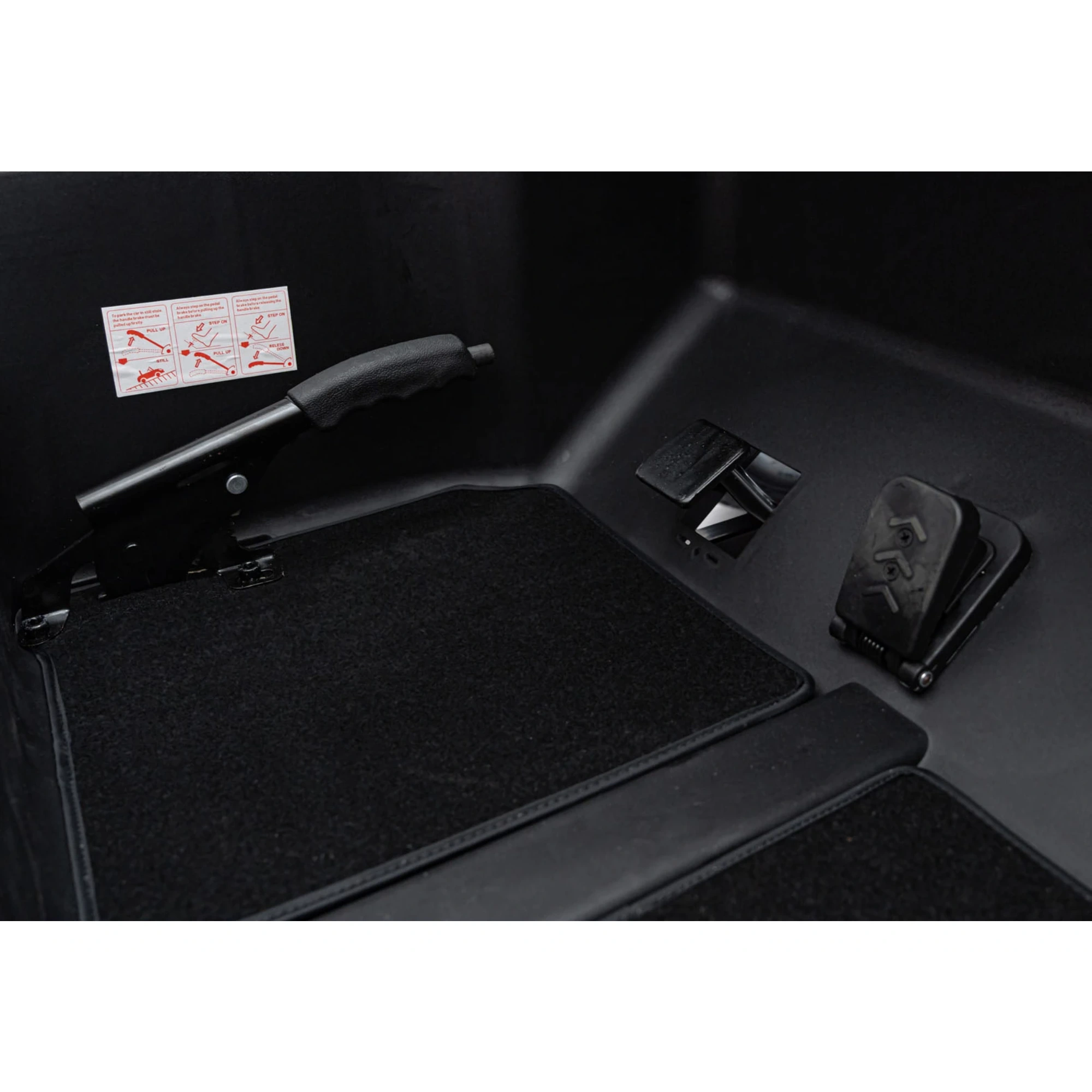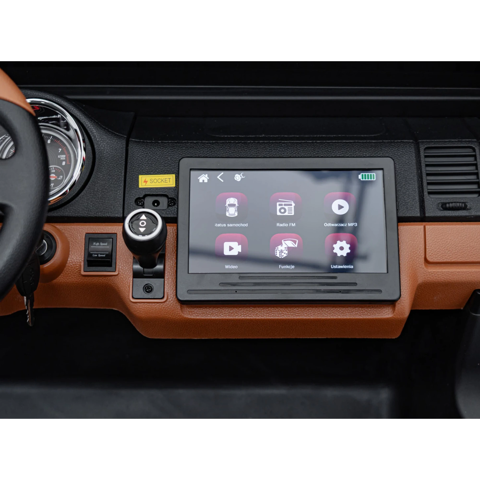 Prędkość płynnie regulowana pedałem potencjometrycznym, hamulec nożny plus dodatkowy hamulec ręczny, maglownica, 2 biegi prędkości maksymalnej, oddzielne ruchome fotele wraz z pasami bezpieczeństwa i w pełni amortyzowanym podwoziem pozwalają młodym kierowcom na w pełni komfortowe poruszanie się po terenach utwardzonych.