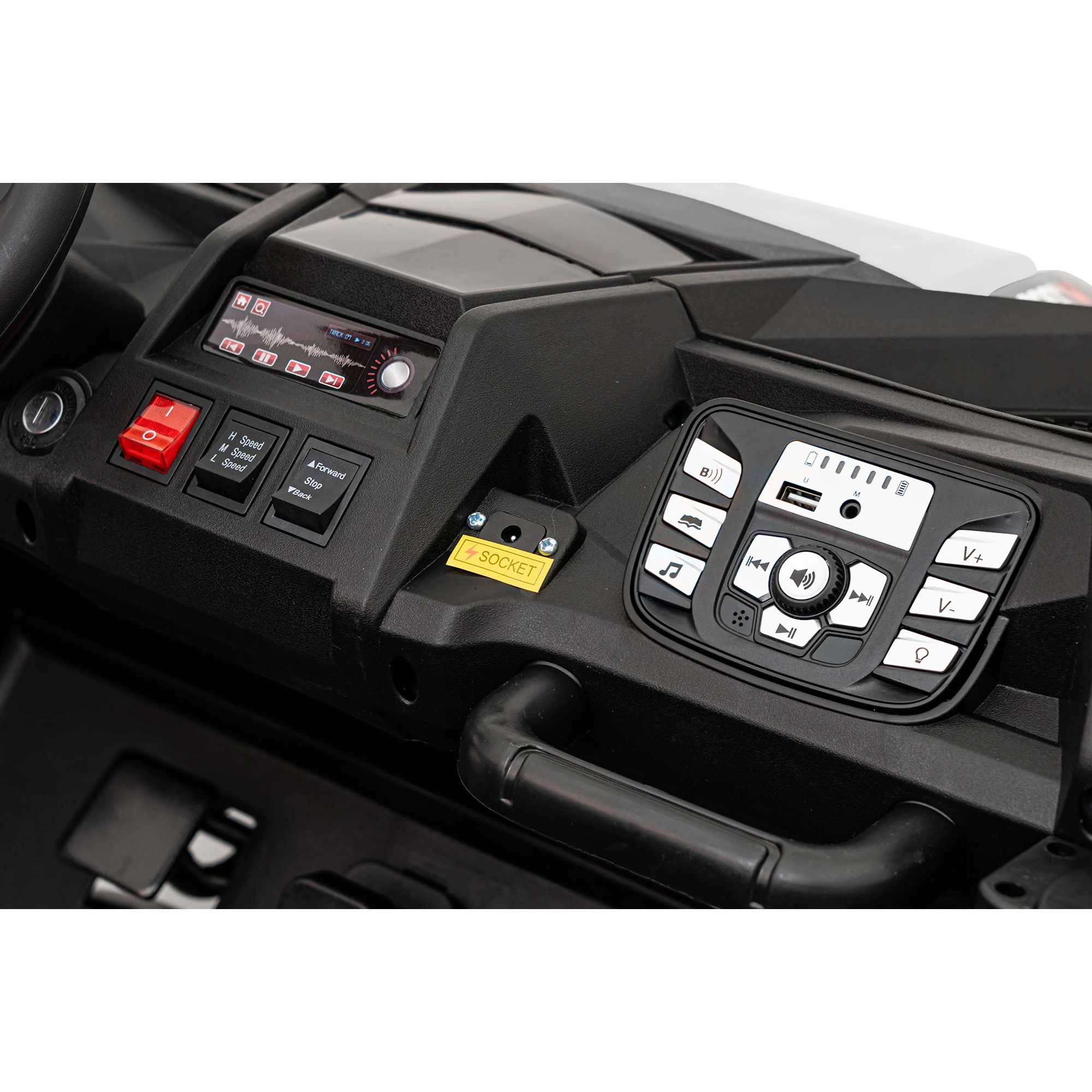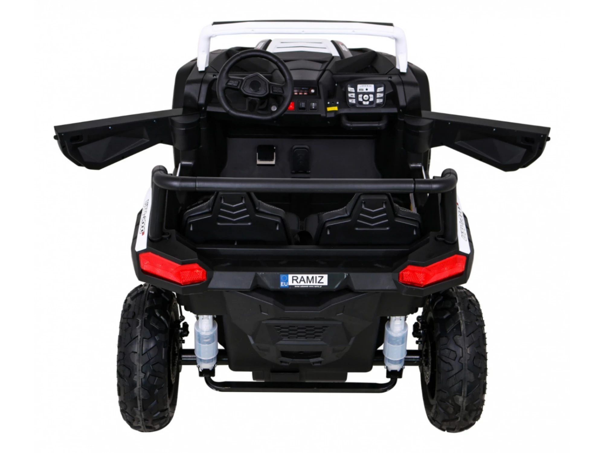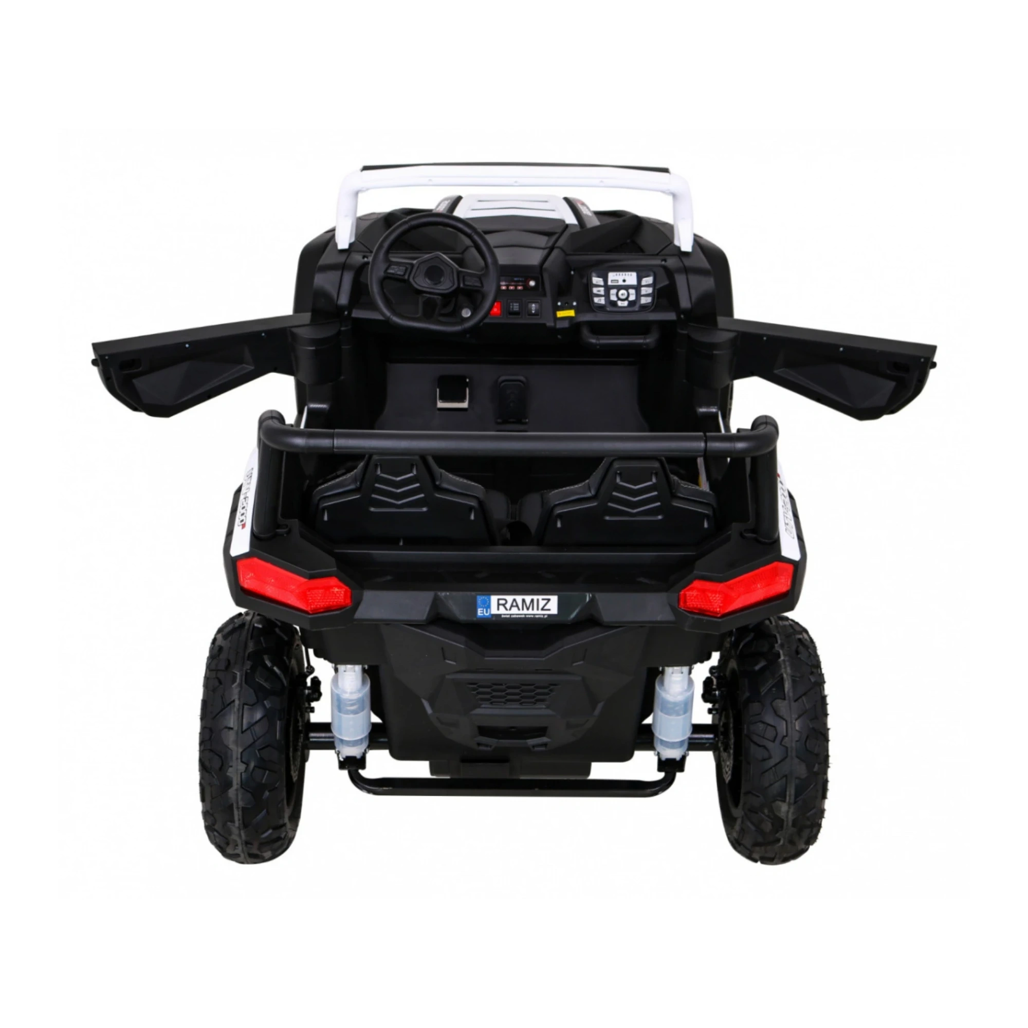 Prędkość płynnie regulowana pedałem potencjometrycznym, hamulec nożny w pedale, 3 biegi prędkości maksymalnej, oddzielne ruchome fotele wraz z pasami bezpieczeństwa pozwalają młodym kierowcom na pierwsze kroki w jeździe off-road.