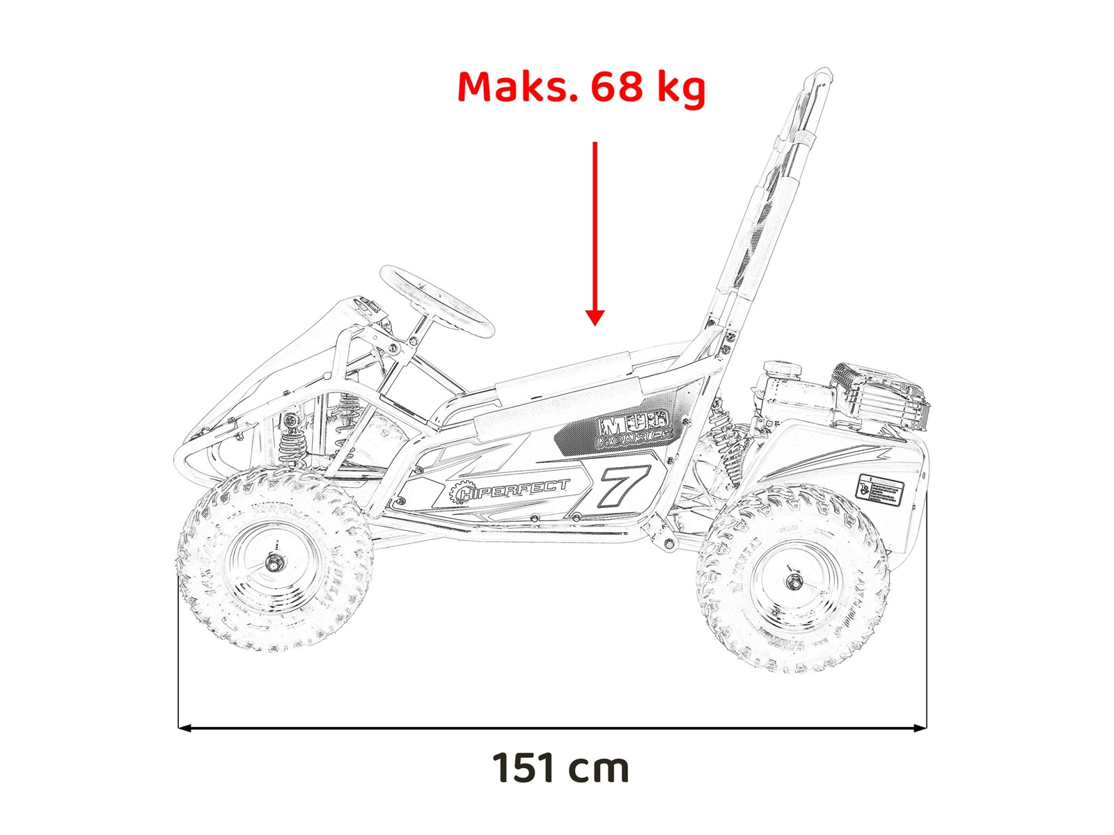 Duży jednoosobowy gokart spalinowy Mud Monster 98cc - to pojazd dla dzieci już 5 lat+ napędzany silnikiem spalinowym 4T o pojemności 98cm3 który bez problemu rozpędza gokarta do 30km/h w terenie jak i na drogach utwardzonych.