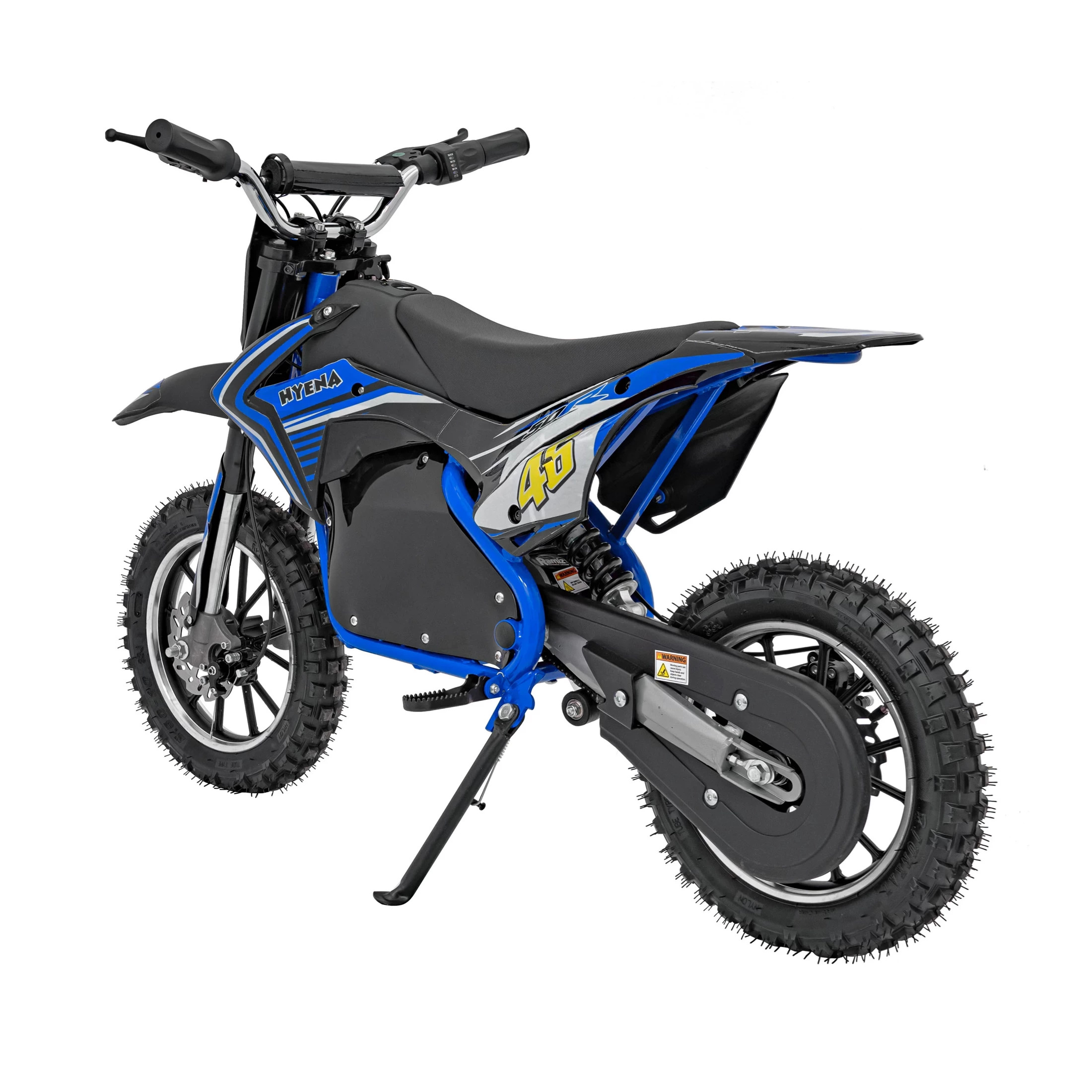 Elektryczny mini crossik dla dzieci już od 4 do 8 lat (minimum 105cm wzrostu) z silnikiem 36V 500W i akumulatorem 36V 9Ah, pełnym amortyzowanym zawieszenie przód / tył i hamulcami tarczowymi także z przodu jak i z tyłu. Mini crossik rozwija prędkość 24km/h co przy jego małych gabarytach wystarcza na rozpoczęcie przygody z crossowym typem mini suportów motorowych a w pełni amortyzowane zawieszenie pozwala na całkiem stabilną jazdę typu off-road.