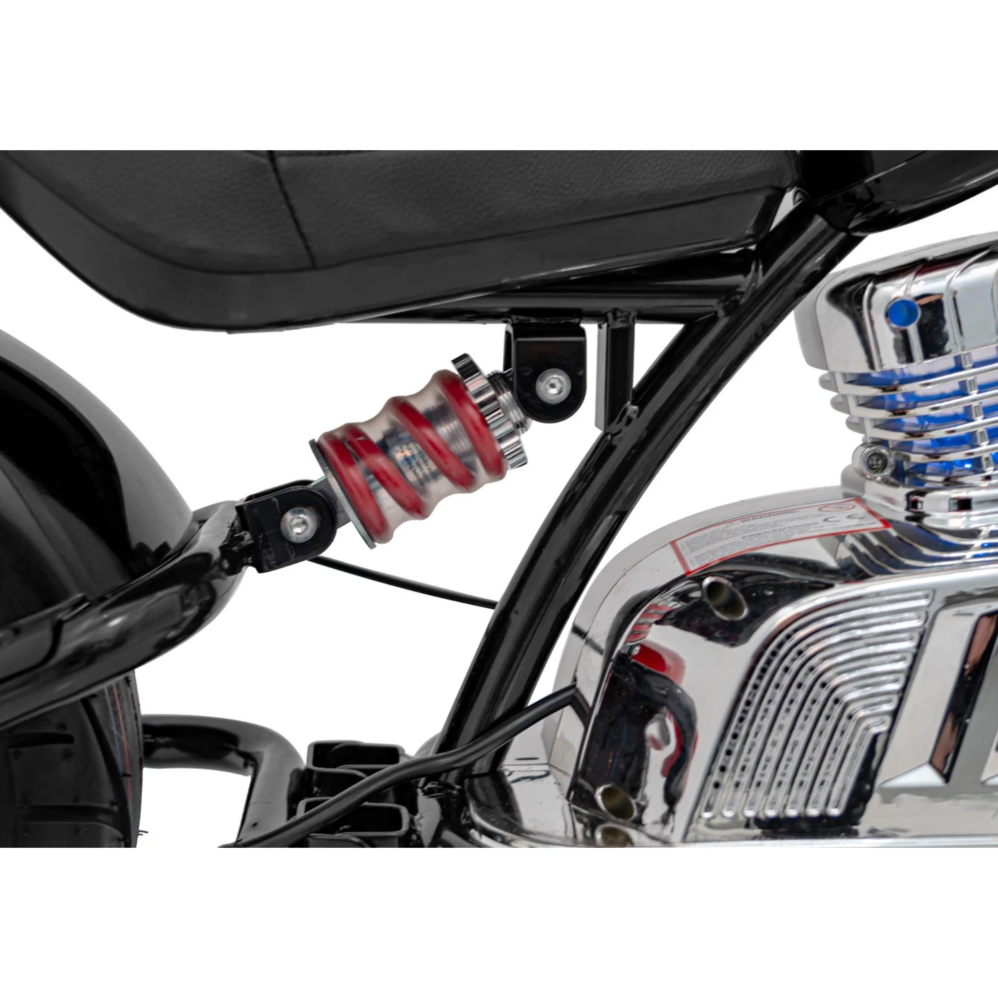 Solidna konstrukcja, regulacja prędkości i hamulec tarczowy zapewniają bezpieczeństwo podczas jazdy. Dodatkowe funkcje, takie jak dźwięk silnika i klakson, sprawiają, że jazda tym chopperem jest jeszcze bardziej atrakcyjna.