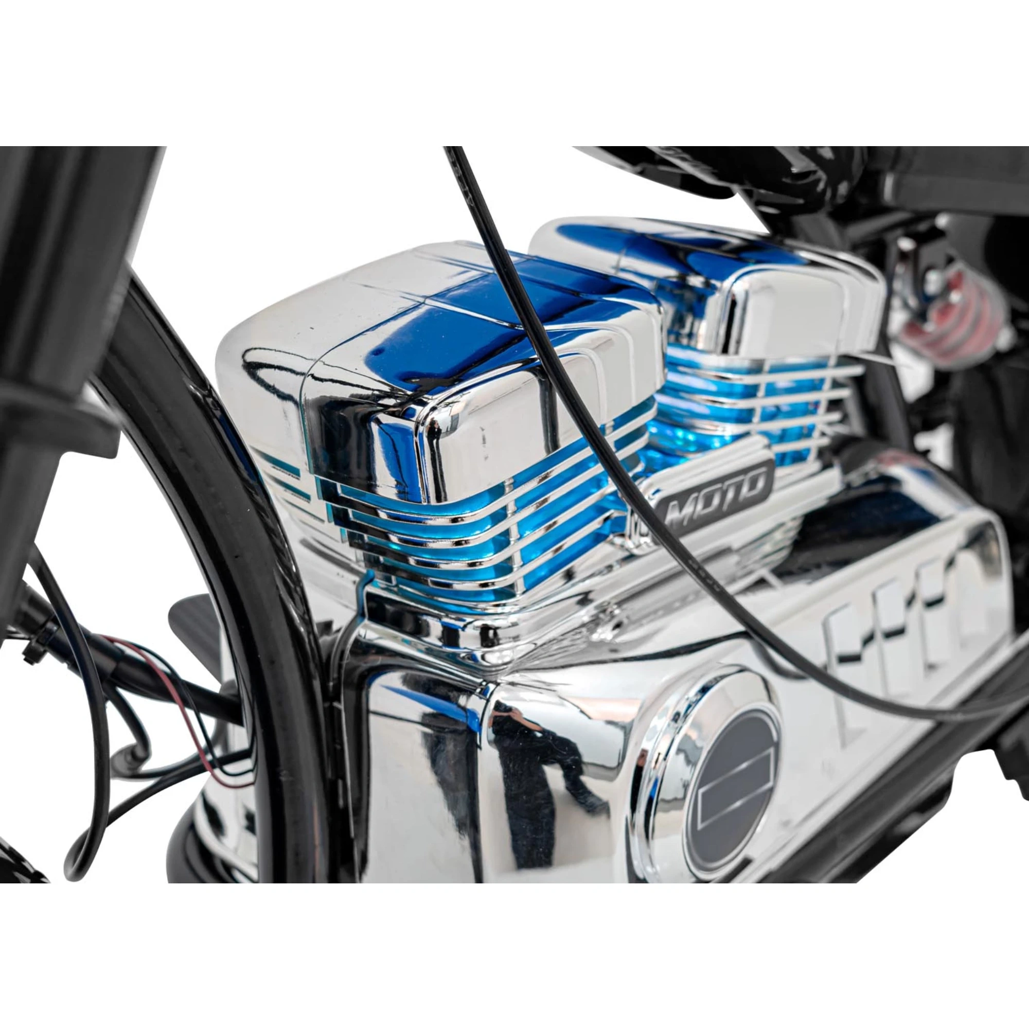Elektryczny mini motorek w bajeranckim stylu rasowego choppera z pneumatycznymi pompowanymi szerokimi oponami i profesjonalnym silnikiem napędowym dla najmłodszych rajdowców już od 3-4 roku życia.