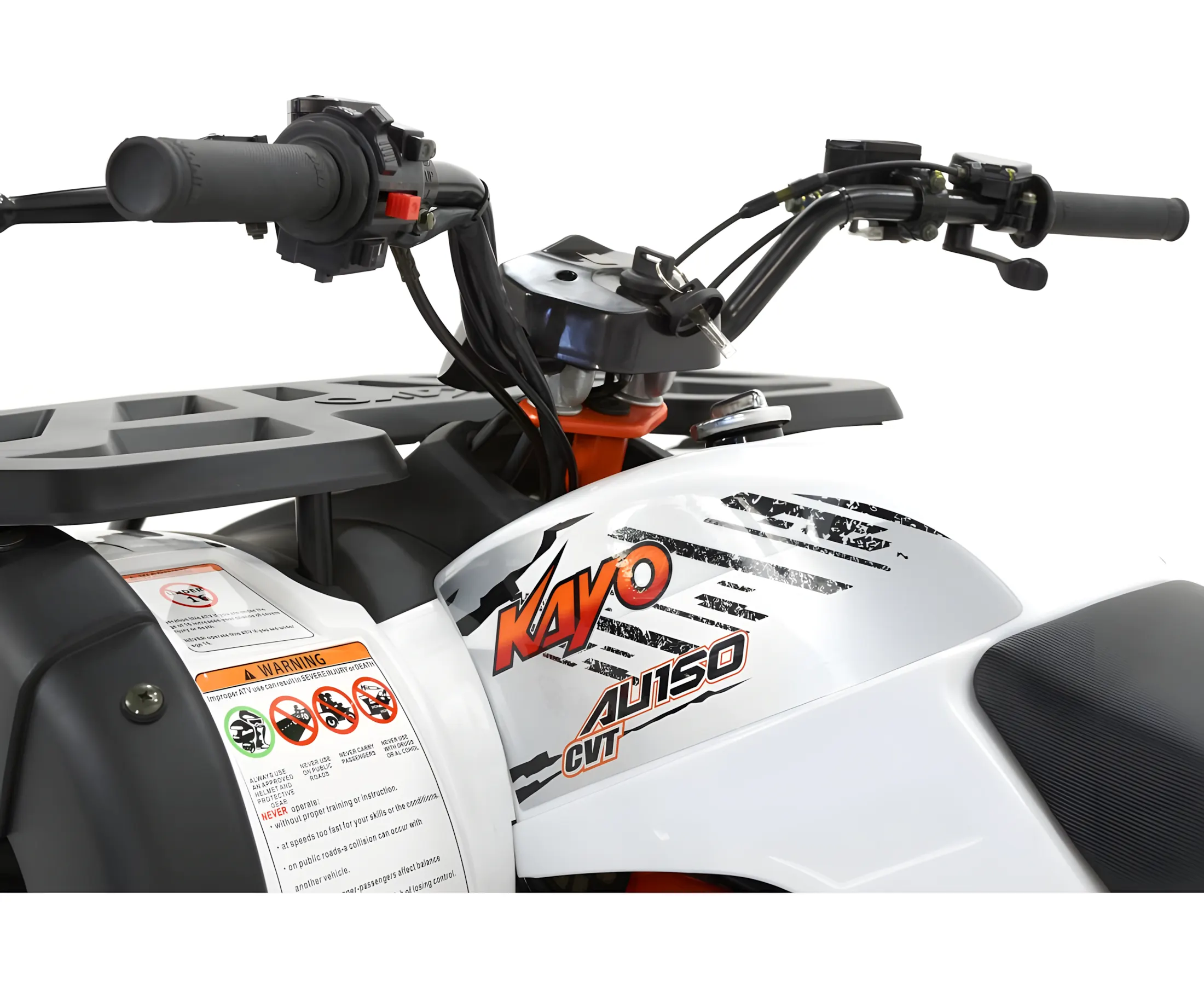 Quad Kayo model A150 – to średniej wielkości quad dla dzieci w przedziale od 8 do 13 lat (minimum 130 cm wzrostu). Quad AU150 jest napędzany silnikiem 4T o pojemności 150cm3 chłodzony powietrzem z pół-automatyczną skrzynią biegów (3 + 0 + R) o prędkości maksymalnej 65km/h. Quad odpalany z rozrusznika został wyposażony w 2 bagażniki przód/tył jak przeprawowy styl pojazdu.